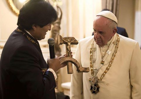 Tiếng reo hò như lễ hội theo nhịp trống lại vang lên khi Đức Phanxicô đi ra khỏi dinh Tổng thống, nơi Tổng thống Evo Morales tiếp ngài. Trong rất nhiều quà và vật dụng trang hoàng mà nhà lãnh đạo Bôlivia tặng có cây thánh giá mang hình Chúa Kitô trên búa liềm và được cho là của linh mục Espinal.