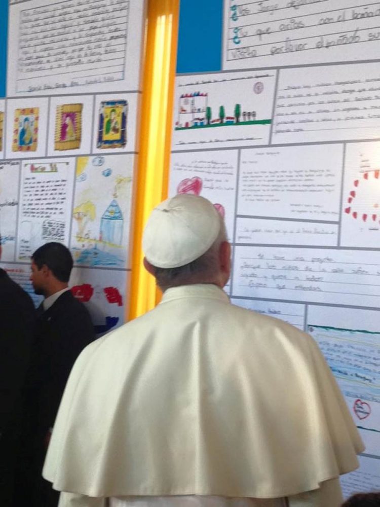 Và các bức thư của các em dán đầy tường bên cạnh nhà nguyện San Juan Bautista, khu phố nghèo Banado Norte nơi Đức Phanxicô sẽ đến viếng thăm cho thấy tâm tư khắc khoải của các em: “Con muốn hỏi cha một câu hỏi. Vì sao các em bé sống ngoài đường đau khổ trong khi Chúa giúp đỡ và yêu thương tất cả mọi người? Con mong cha hiểu.” Câu này giống như câu của em Glyzelle Palomar, 12 tuổi ở Phi Luật Tân đã hỏi Đức Phanxicô: “Có quá nhiều trẻ em bị chính cha mẹ bỏ rơi, quá nhiều trẻ em bị biến thành nạn nhân của thuốc phiện và mại dâm và đủ thứ kinh khủng khác xảy đến. Tại sao Chúa lại để những điều này xảy ra cho các trẻ em vô tội? Và tại sao lại có quá ít người giúp đỡ chúng con?” Đức Phanxicô đã bỏ bài diễn văn soạn sẵn đến ôm em một hồi lâu.