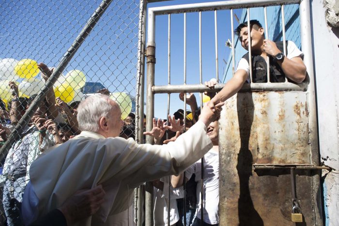 Hình: Các tù nhân ngạc nhiên trước sự gần gũi của Đức Phanxicô với họ. Đức Phanxicô đến thăm trại tù Santa Cruz trong chuyến đi Bolivia ngày 10 tháng 7-2015.