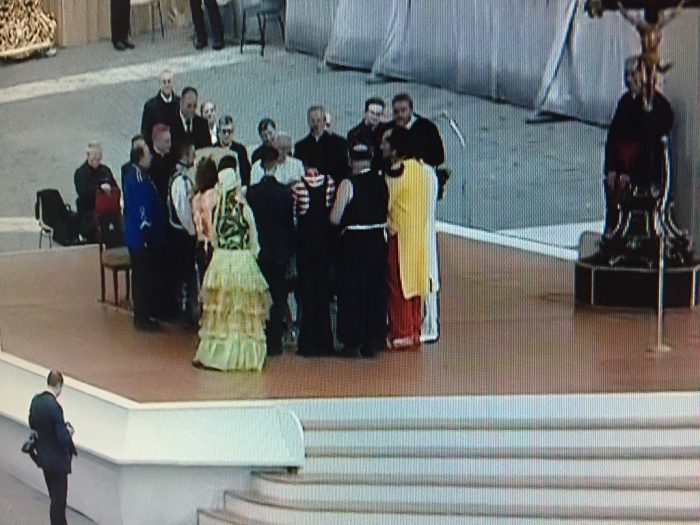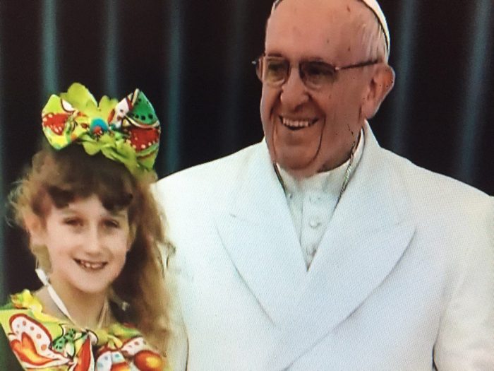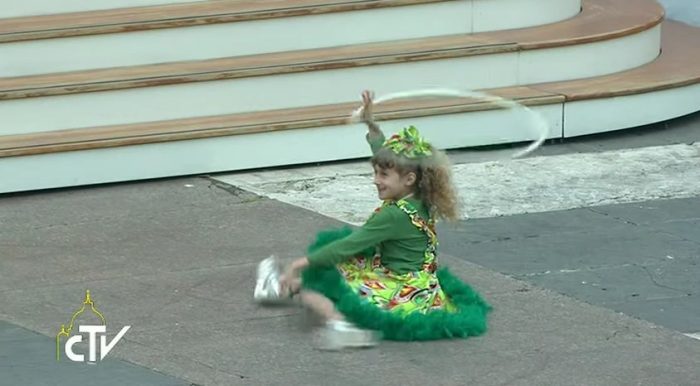 Sau các nốt nhạc cuối cùng là tiết mục khạc lửa, người nghệ sĩ đã khạc một bong bóng lửa thật lớn, một em bé gái trong bộ môn thể dục dụng cụ đến gần Đức Phanxicô để hôn ngài. Và Đức Phanxicô ra dấu để cả nhóm đang còn ngần ngại cùng lên khán đài với ngài. Tươi cười, ngài chào từng nghệ sĩ một, ngài trao đổi vài lời chúc với họ.