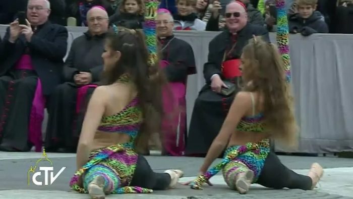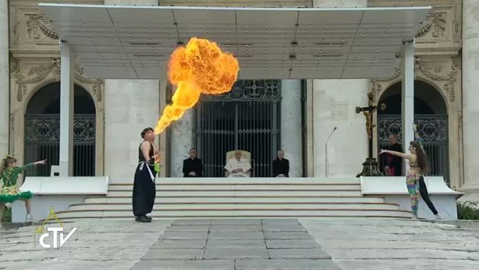 Các nghệ sĩ thể dục dụng cụ và nghệ sĩ khạc lửa đã có các tiết mục ngắn biểu diễn trong buổi tiếp kiến chung ngày 22 tháng 2-2017 tại Quảng trường Thánh Phêrô.