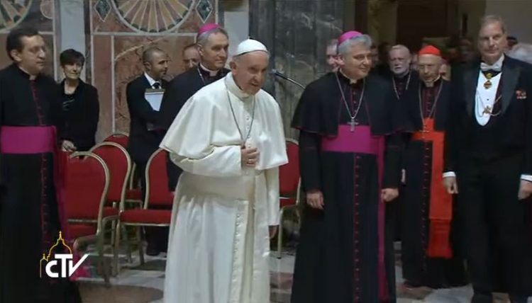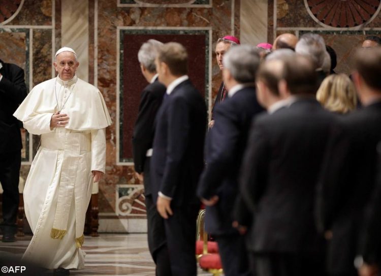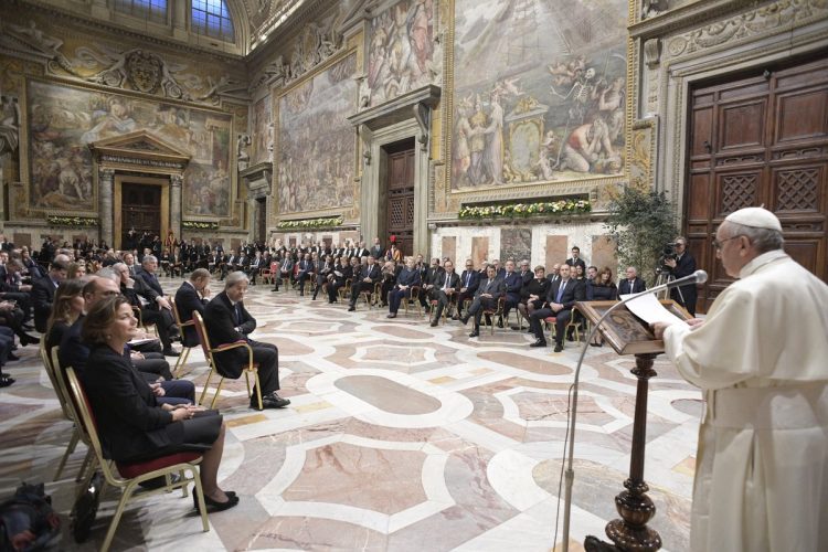 Buổi tiếp kiến diễn ra ở Phòng Hoàng Gia Dinh Tông Tòa làm gợi nhớ những giây phút trọng đại trong lịch sử Giáo hội, mở đầu bài diễn văn Đức Phanxicô nhắc lại các nền tảng trong việc xây dựng Âu châu. Dựa trên các lời của các nhà sáng lập, ngài nhấn mạnh đến “tinh thần phục vụ, hiệp nhất hành động chính trị và ý thức ‘văn minh Âu châu có gốc rễ từ kitô giáo’”.