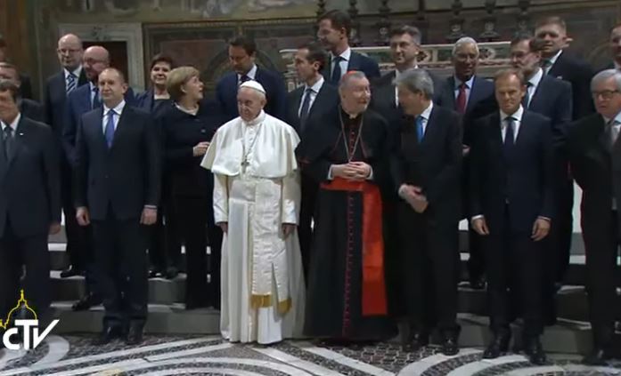Chiều thứ sáu 24 tháng 3, Đức Phanxicô đã tiếp 27 nhà lãnh đạo Quốc gia thuộc Liên Hiệp Âu Châu tại Vatican. Ngài nhấn mạnh đến hy vọng của một tương lai trong việc xây dựng Âu châu. Các lãnh đạo Quốc gia về Rôma họp nhân kỷ niệm 60 năm ngày Hiệp ước Rôma do các nhà sáng lập Âu châu ký.