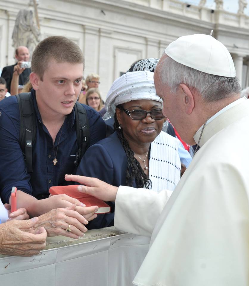 Khi ngài ngồi trên ghế, ngài chỉ cách chúng tôi vài mét. Buổi tiếp kiến bắt đầu bằng đoạn Phúc Âm Thánh Matêô, ngài đọc bằng tiếng Ý. Đầu óc tôi mở ra, chúng tôi hiểu một vài ý chính: “Giáo hội là mẹ”, là nhà giáo dạy chúng ta sứ điệp đầu tiên của Chúa Kitô: lòng thương xót! (Một vài người sẽ cho là cổ điển nhưng khi Đức giáo hoàng nói thì có tác dụng mạnh hơn).