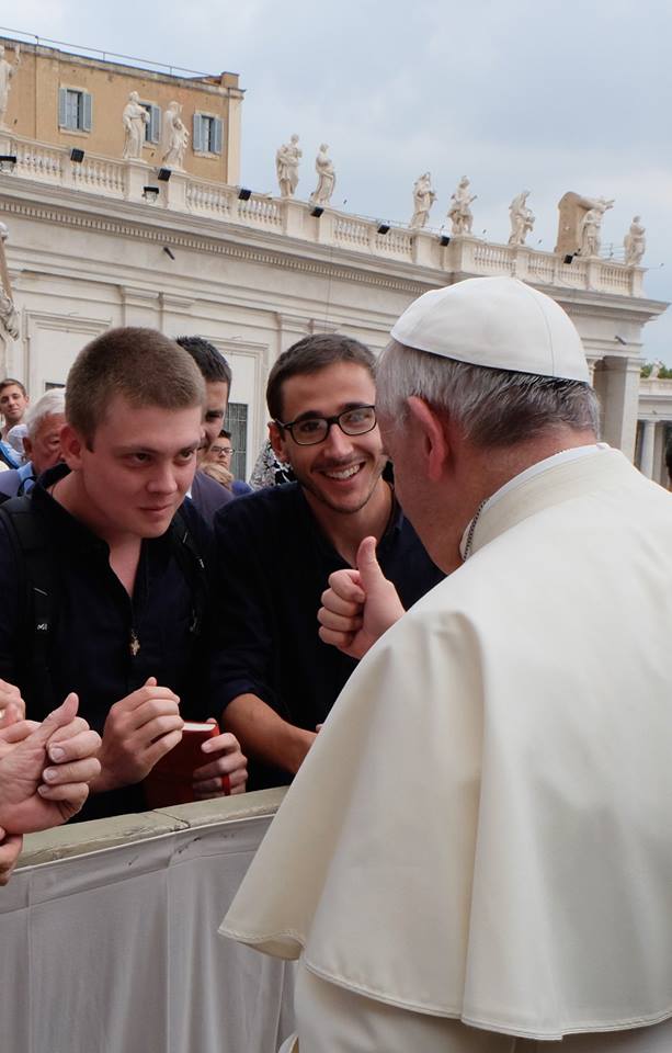 10h00. Xe giáo hoàng đi một vòng ở Quảng trường Thánh Phêrô, các khách hành hương đủ các quốc tịch, Ý, Mỹ, Bồ Đào Nha, Mễ Tây Cơ, Argentina. Rất nhiều khách hành hương Argentina, rất nhiều. Rồi ngài xuống xe, mạnh mẽ bước lên bậc cấp, chúng tôi có thể thấy rõ dáng đi, gương mặt của ngài: ngài cười, có vẽ như ngài hạnh phúc được gặp chúng tôi. Chúng tôi cũng vậy.